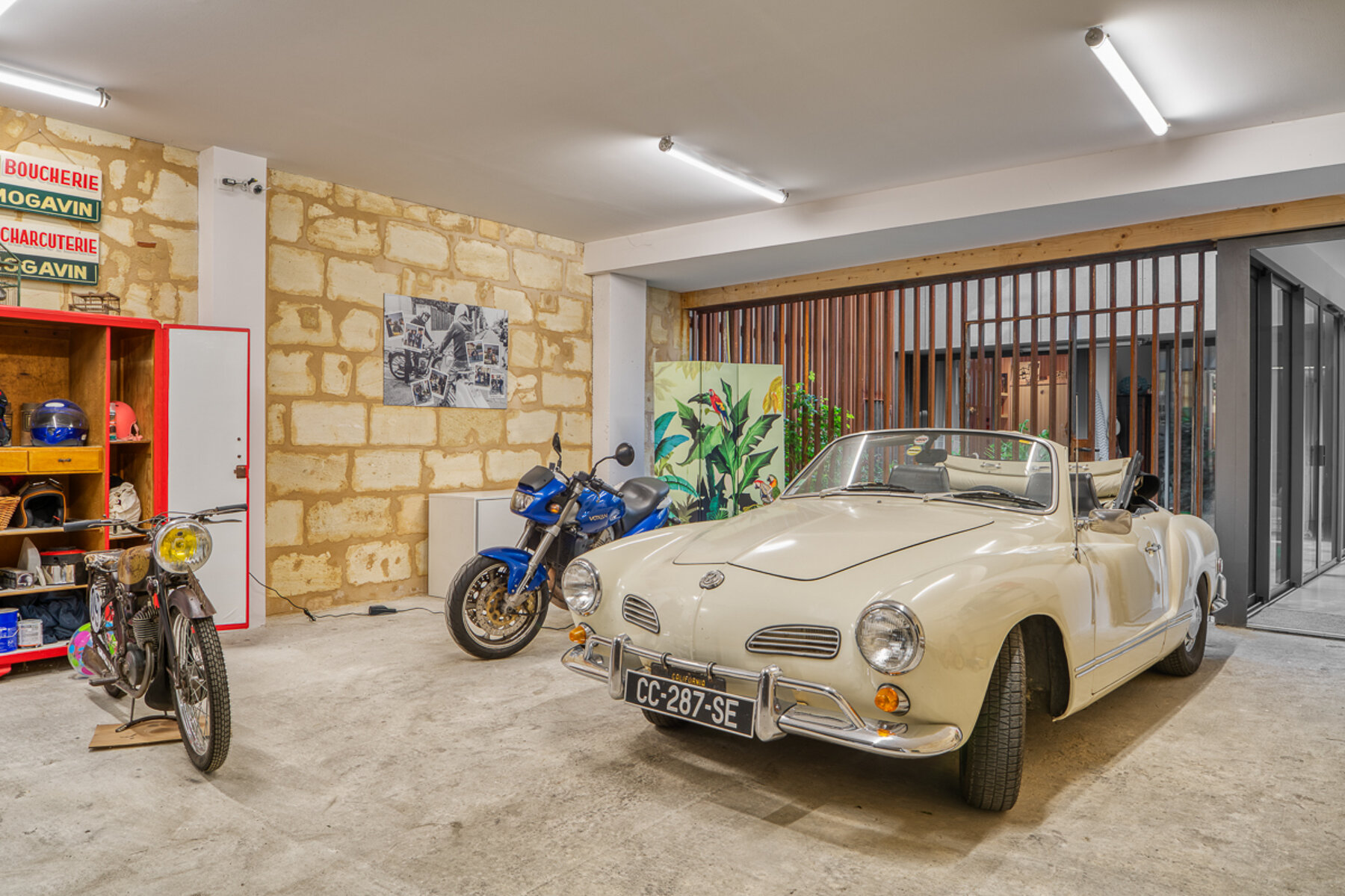 La seconde partie du projet est la transformation des 2 entrepôts pour créer un garage commun et un lieu d’habitation en fond de parcelle. Ce loft se développe sur environ 300m² habitables répartis sur 2 niveaux. 2 patios toute hauteur sont créés aux extrémités pour apporter lumière et ventilation naturelles. Le niveau rez-de-chaussée regroupe 3 chambres et leurs salles de bains, une buanderie et un espace détente bureau-tv. A l’étage, l’esprit industriel des lieux est préservé en très présent. Les charpentes métalliques sont conservées intactes par la pose de panneaux isolants extérieurs, la pièce à vivre totalement ouverte est entièrement vitrée sur le patio plein Sud, un petit bassin est implanté sur ce niveau et réalisé au-dessus de la cave à vins. Le revêtement intérieur en pierre se prolonge à l’extérieur et forme également les margelles de la piscine pour un ensemble homogène. La suite parentale fait face au salon ; elle bénéficie d’un balcon qui surplombe le patio d’entrée avec vue sur la piscine. Le garde-corps est formé de tubes en acier brut, qui se retournent le long du bassin et descendent jusqu’au rez-de-chaussée. La végétation est omniprésente à l’intérieur de la maison ; de nombreuses jardinières sont réalisées sur mesure en acier, visibles ou encastrées dans des ouvrages maçonnées, elles permettent l’agrément de nombreuses plantes et arbustes qui colonisent le volume habité pour donner la perception d’un réel jardin.