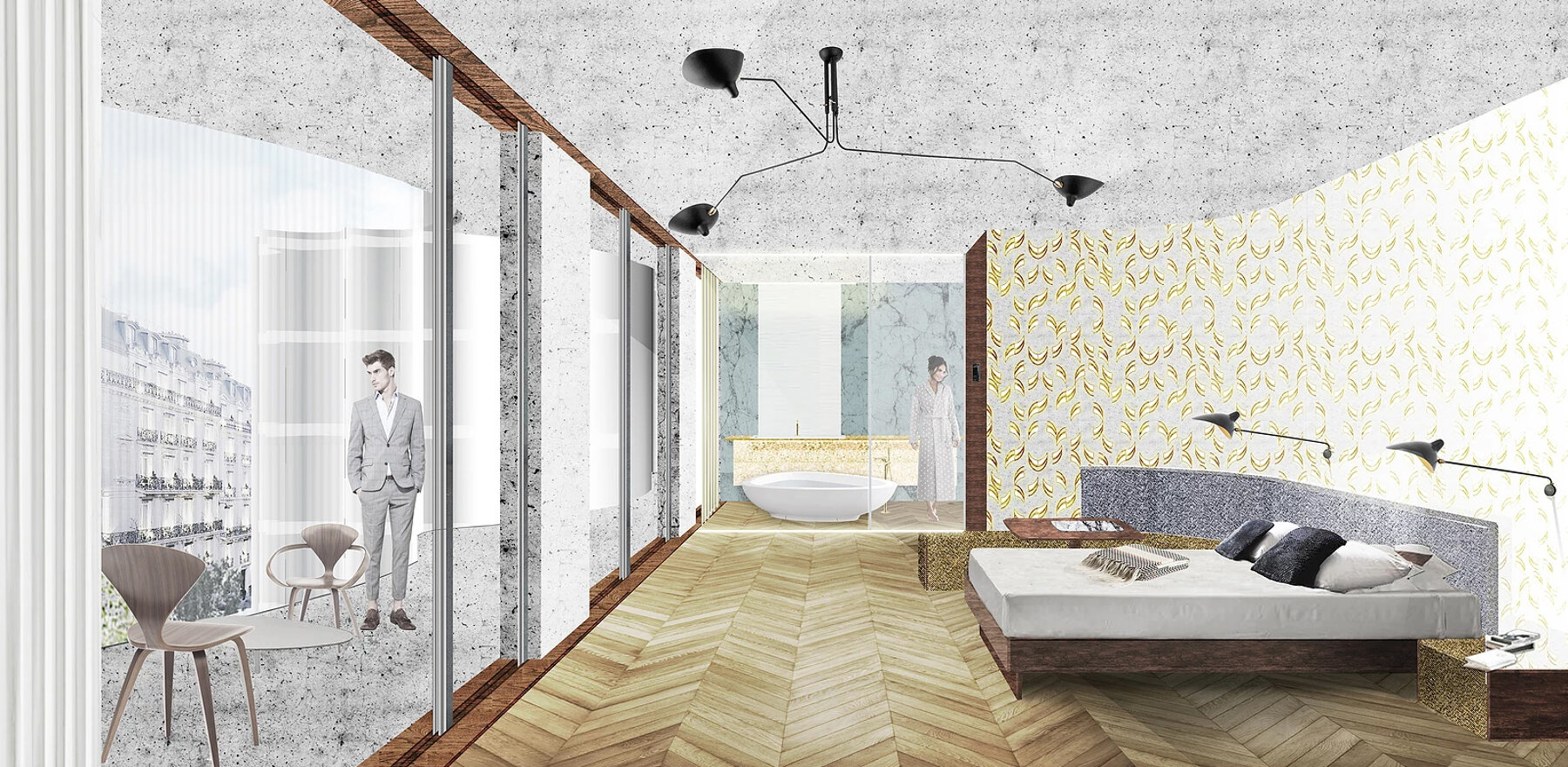 Le Crystal Bleisure Palace fusionne ces usages au travers d’une collection de pièces tridimensionnelles variées constituant aussi bien les chambres, les activités et les espaces distributifs. Tous font partie d’un même système au sein duquel les équipements semblent être creusés dans la masse de l’hôtel. Différentes strates d’ambiance se superposent au travers de cinq thèmes: Welcome & Shop - Culture & Play - Health & Relax - Work & Business - Eat & Party. Un vide central intérieur serpente verticalement entre les volumes pour révéler cette effervescence programmatique et éclairer le cœur du bâtiment. Autour de cet atrium, sont connectés à la fois les chambres et les différentes activités, au travers d’un système d’enfilade de pièces qui ménagent vestibules, petits salons, antichambres... assurant la progression vers l’intimité. La transformation de ces lieux de passage en espaces appropriables crée un sentiment de domesticité. Les chambres elles mêmes se présentent comme des appartements avec des pièces en enfilade, largement ouvertes sur un balcon filant, protégés par un voile de verre. La mise à disposition de salles de réception privative en étage constitue un prolongement supplémentaire de la chambre. La proposition allie le prestige d’une spatialité oubliée, celle du palais, et de ses successions de grands volumes, à des réflexions contemporaines, d’usages et d’écriture. Intemporel et situé, le Crystal Bleisure Palace propose une expérience architectonique singulière entre massivité et légèreté, monumentalité et domesticité, effervescence et intimité.