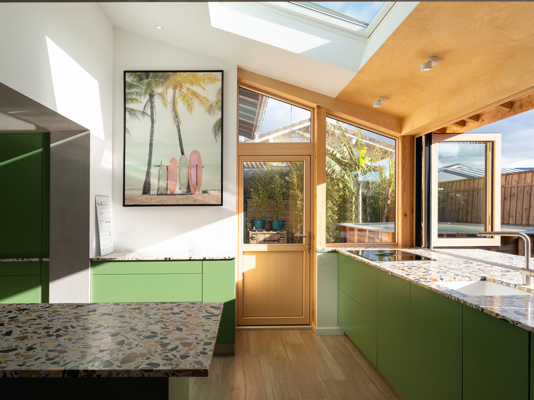 Le projet consiste en la transformation et l'agrandissement d'une cuisine. La structure a été réalisée en ossature bois, isolée en fibre de bois et recouverte de tuiles. L'idée directrice du projet était de créer un espace intermédiaire entre l'intérieur et l'extérieur : une alcôve permettant de boire, discuter et manger. Cet espace de transition vers la terrasse extérieure rappelle l'estanquet gascon, lieu de réunion et de convivialité.