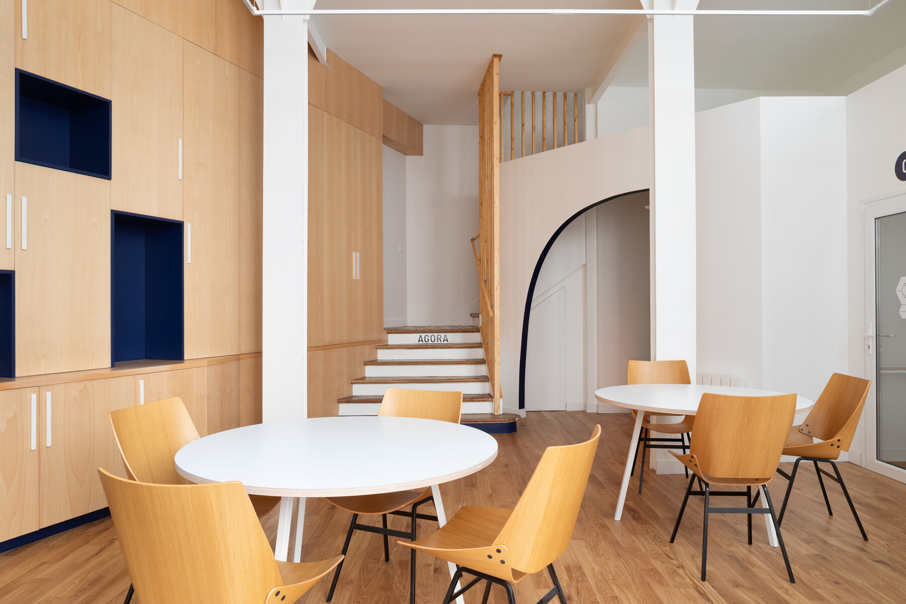 S'adapter à la mission de l'entreprise orientée sur le bien-être au travail / Proposer des solutions d'usage et spatiales spécialisées / Créer du mobilier à partir de matériaux de réemploi / Rénover un bâti très abimé en optimisant le budget / Reconfigurer les espaces, Designer le Mobilier et les aménagements sur mesure des bureaux de l’entreprise spécialiste des questions sociales et du design des organisations
