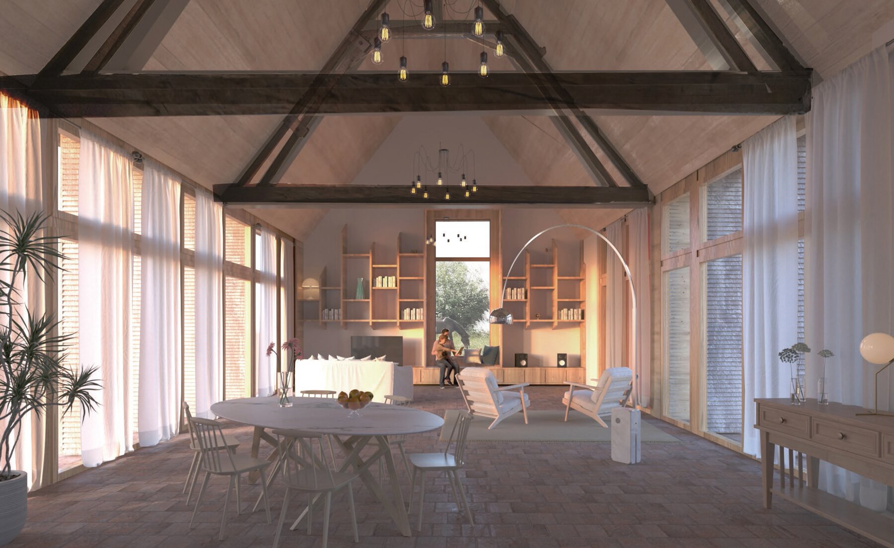 Il s'agit de la réhabilitation d’une ferme en habitation. Le projet offre de grandes pièces avec de belles hauteurs sous plafond. Cette maison est particulièrement lumineuse garce à ses nombreuses baies vitrées qui donnent sur le grand espace vert extérieur, aménagé.