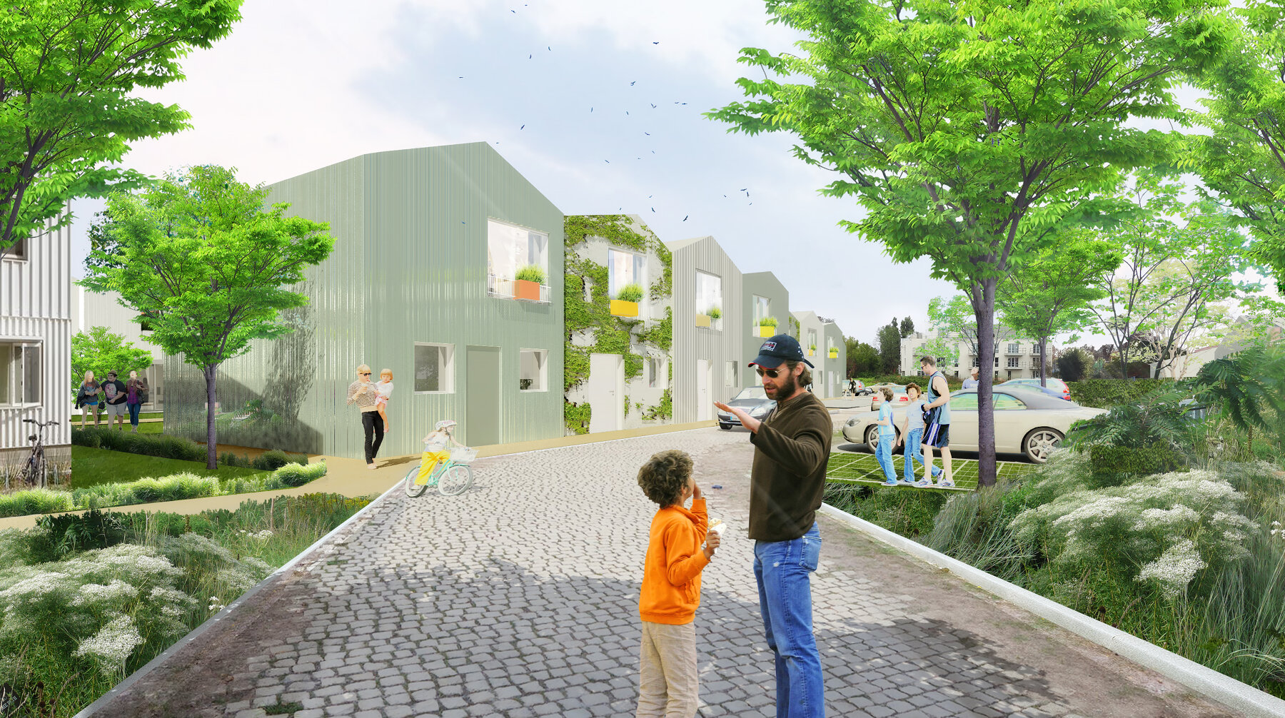 Exploiter la reproductibilité sérielle d’un programme de logements sociaux pour créer une urbanité qui densifie en douceur un tissu d’habitat pavillonnaire.