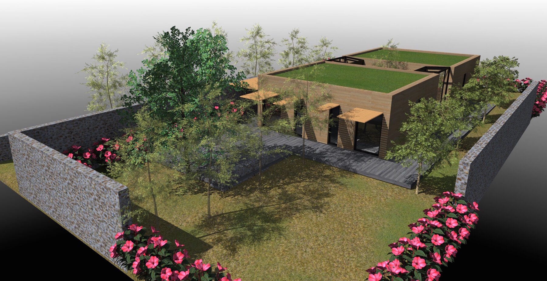 Cette maison est composée d’un volume compact de base rectangulaire, construit en ossature bois. La toiture est végétalisée. L’emprise de la maison est rectangulaire. Le patio est également rectangulaire et s’implante dans une faille vitrée au cœur de la maison. Il permet d’articuler les espaces jour et les espaces nuit.
