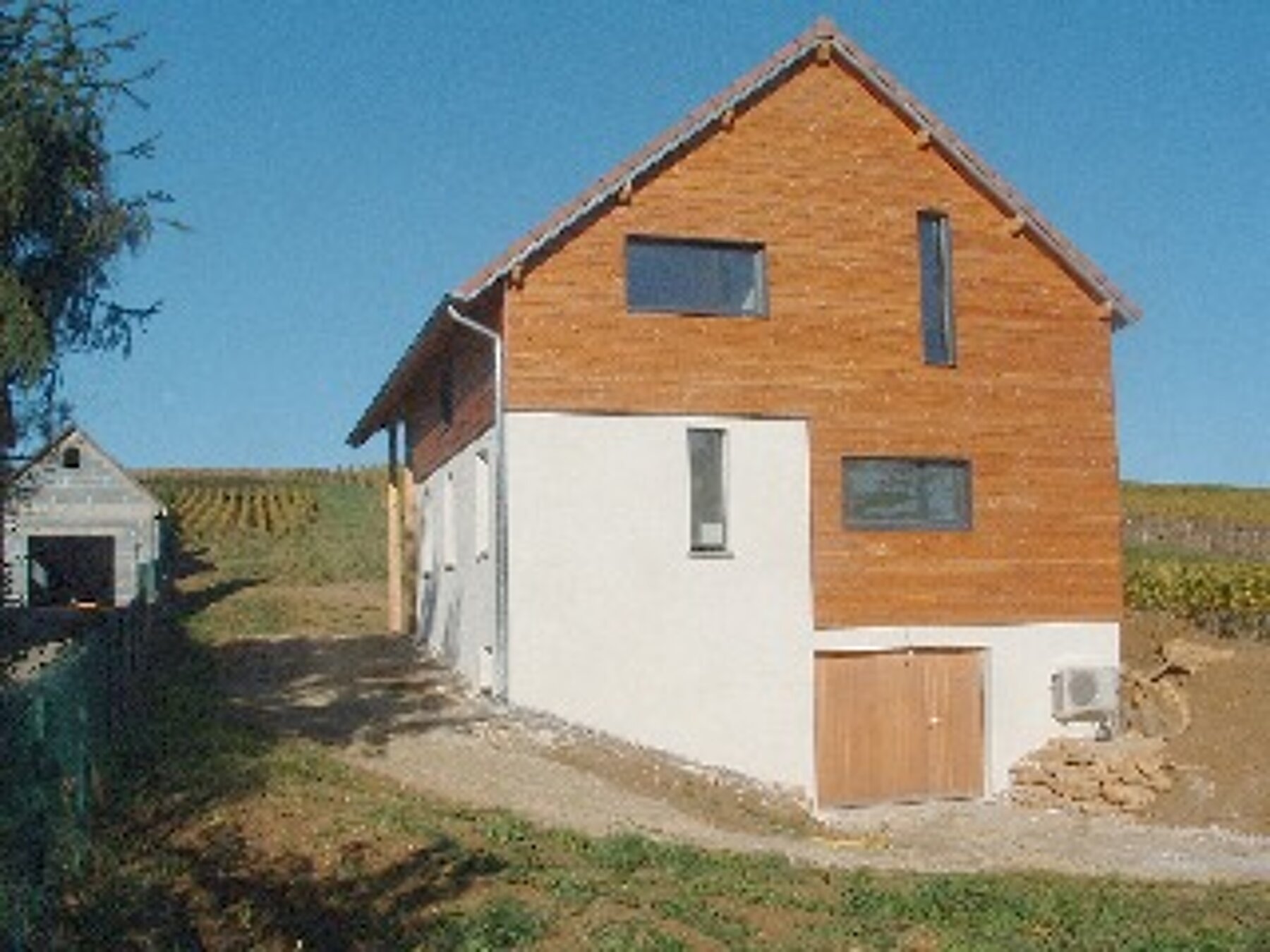 Construction mixte brique alvéolaire + OB (ossature bois), ITE partielle sous bardage, sarking en toiture, poêle contre mur intérieur en briquette, PAC, VMC DF, ECS Thermodynamique, terrasse abritée, ss-sol complet dont citerne EP