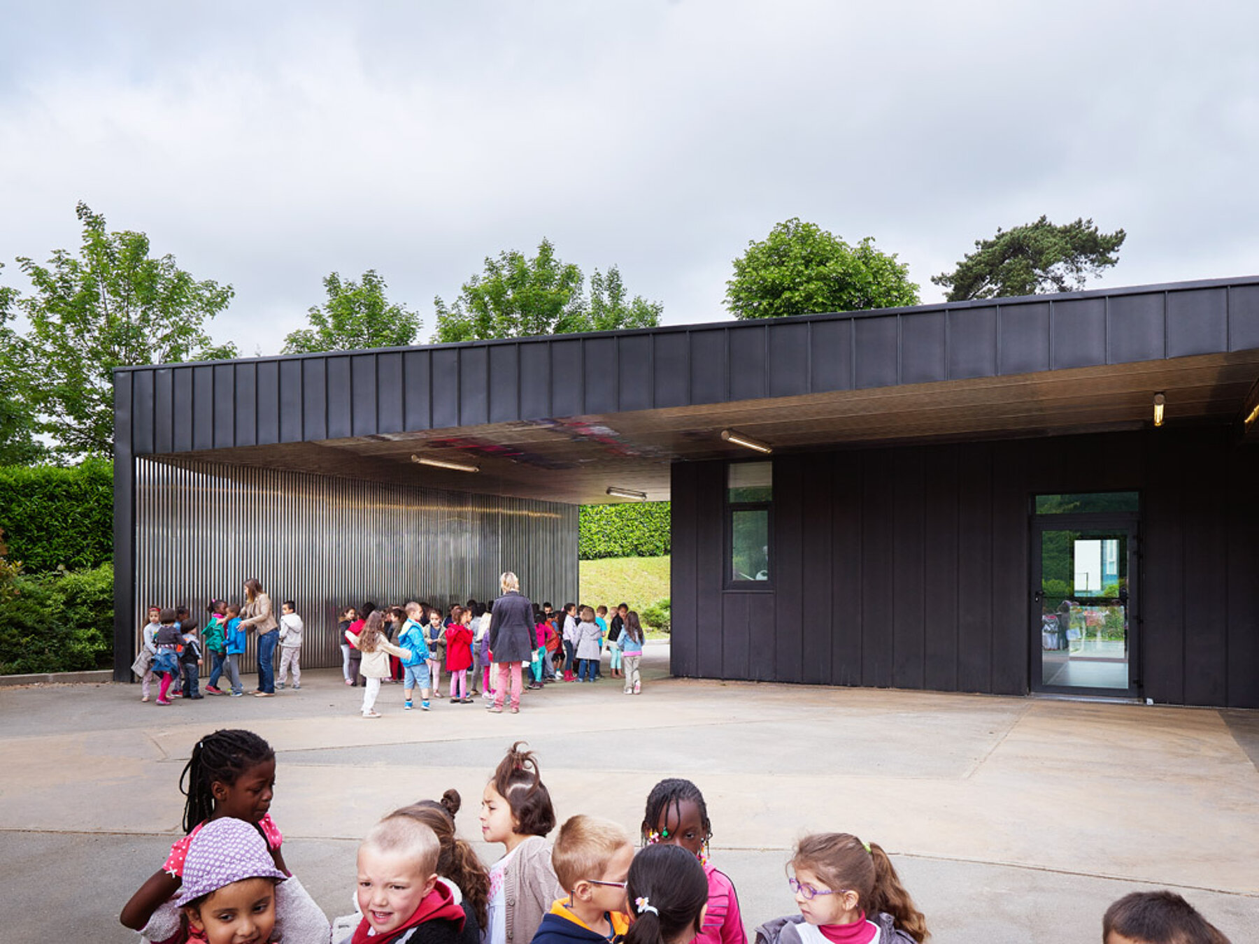 La conception de l’extension de l’école maternelle des Alliés de Chavannes découle de l’environnement paysager et de son intégration au site. Les trois nouvelles extensions sont connectées à la circulation longitudinale du bâtiment existant afin de percevoir les nouveaux volumes comme des pavillons séparés. Le corps de bâtiment existant, quant à lui, est reconfiguré pour devenir l’épine dorsale de l’établissement. Distingués par un traitement métallique, les nouveaux volumes permettent une lisibilité claire entre le bâtiment d’origine et l’extension. Les nouveaux volumes s’organisent de façon à garantir une fluidité et une organisation programmatique en harmonie avec le fonctionnement existant de l’école. Leur implantation s’insère logiquement entre les arbres existants tout en ménageant des vues vers la végétation. Posés sur des pilotis et avec des façades permettant d’offrir à chaque espace des orientations différentes, ces nouvelles extensions permettent à tous les enfants de se sentir comme dans une cabane dans les arbres !
