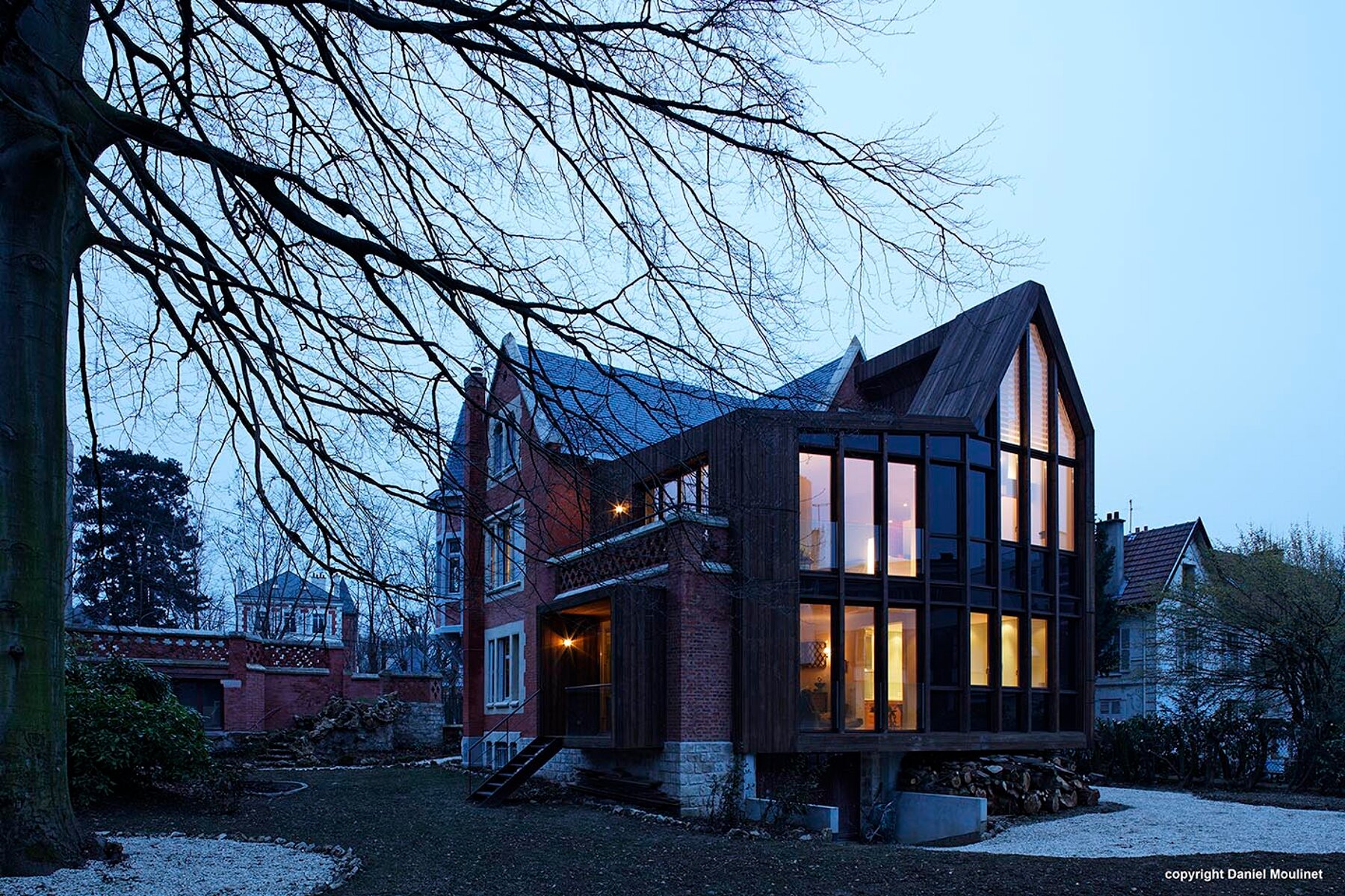 nous l’avons préféré en concertation avec l’ABF, de la préserver afin de laisser les traces des différentes époques, et d’affirmer, pour l’extension, une écriture architecturale contemporaine renforçant la verticalité de la maison sans alourdir sa volumétrie.