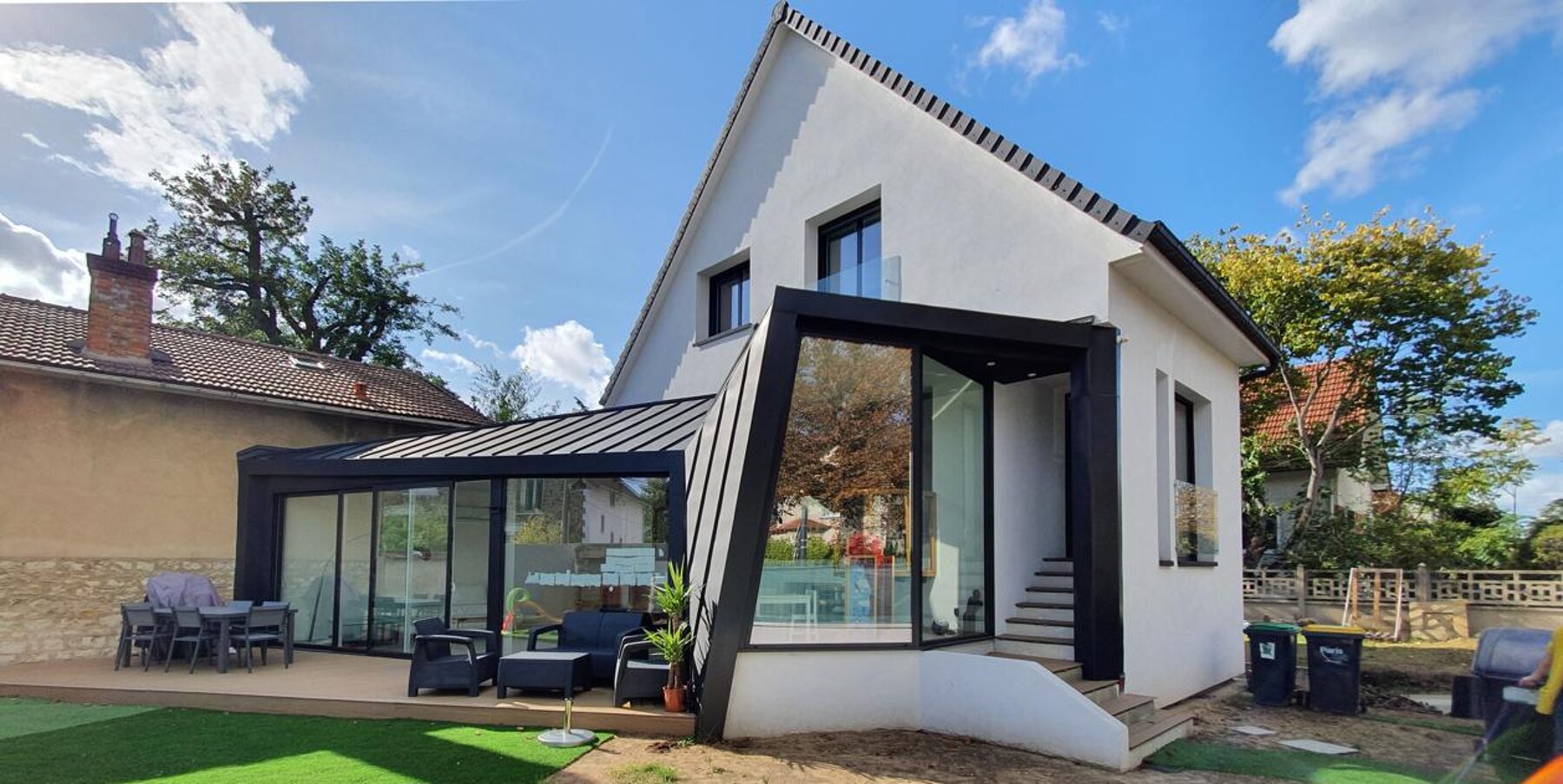 Le Client voulait un dessin avec des biais et des volumes non conventionnels, le souci, comme souvent dans les extensions c’était comment ne pas assombrir l’intérieur de la maison existante une fois le nouveau bâtiment sur place. Nous avons donc proposé cette grande baie triangulaire qui fait filtrer les rayons de soleil jusqu’à la salle à manger.