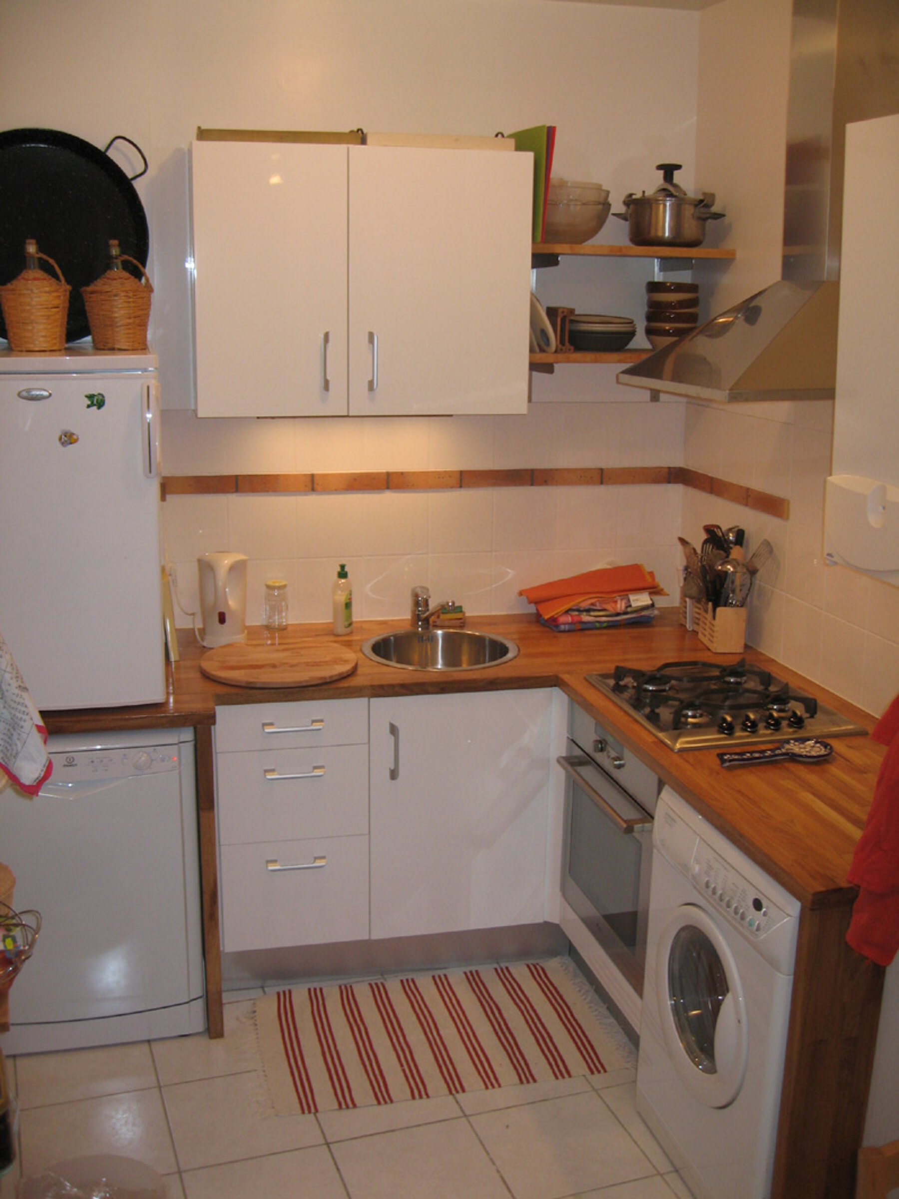 Cet appartement de la Rue Saint Denis a été loué avec le minimum réglementaire : un évier. Les locataires ont choisi de consulter un architecte pour aménager l’espace. Une cuisine équipée (avec four, lave-vaisselle, plaques de cuisson à gaz et lave-linge) a été installé. L’optimisation de l’espace a permis d’accueillir une table à manger à proximité de la grande baie vitrée donnant vers la cour.
