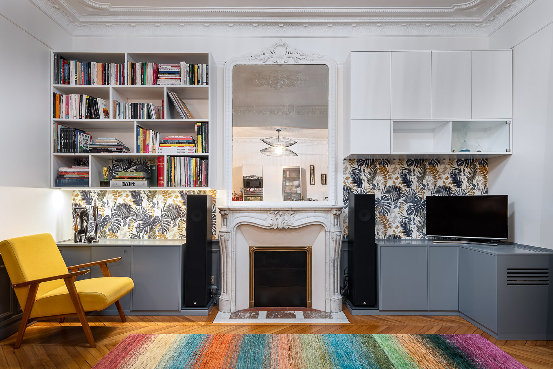 Un espace de rangement en partie basse a été également crée, s'intégrant parfaitement avec le soubassement mouluré existant.