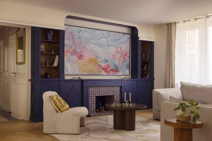 Rénovation complète d'un appartement de 135m² conçu et suivi par Mirabel Studio avec redistribution des pièces comprenant une entrée, un séjour avec cuisine, un bureau, un WC, une salle d'eau, 3 chambres et une suite parentale avec salle d'eau attenante (chantier en cours de finition). En termes d'esthétique, Esther Mirabel a investi un design transitionnel associant tradition et modernité.