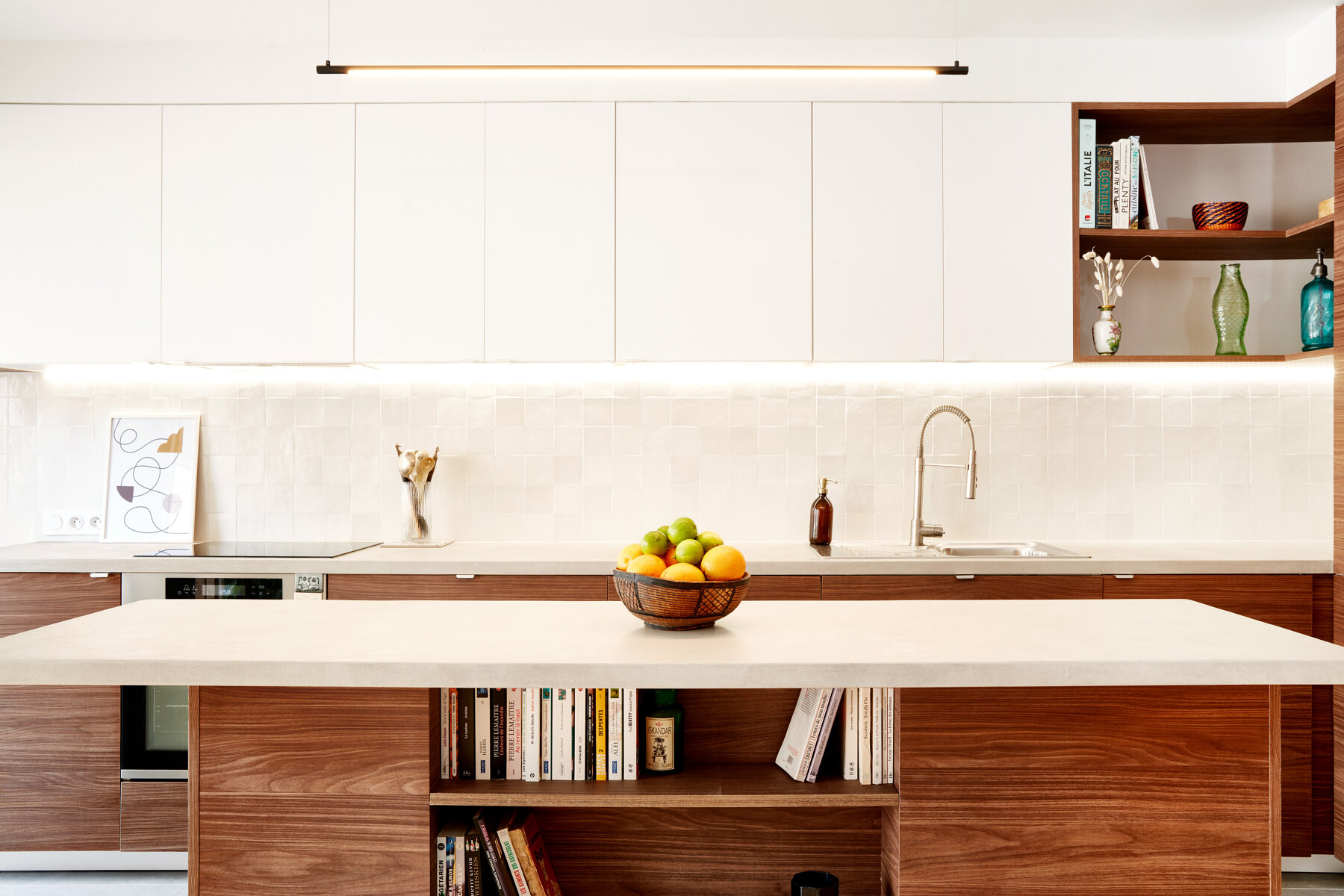 La mise en place d'un claustra et meuble d'entrée permet de différencier l'entrée et le séjour suite à la démolition de la cloison séparative. Face à l'entrée on trouve le vestibule, peint en vert et donnant sur les sanitaires. L'intervention vise à doter l'appartement d'une pièce de vie généreuse comprenant une bibliothèque sur mesure et donnant sur une cuisine ouverte avec ilot central.