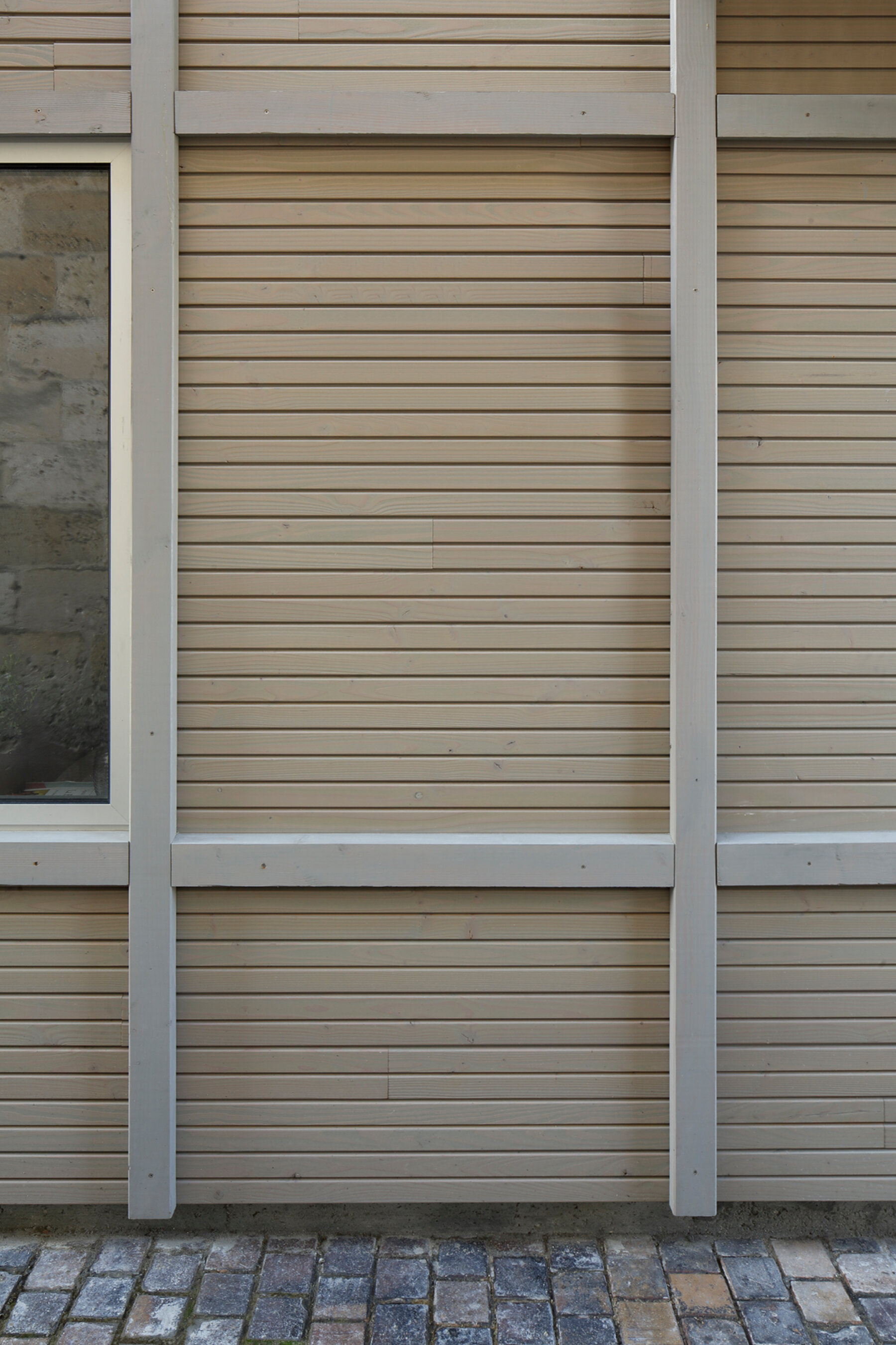 La façade du projet s’inspire du déjà-là et propose une réinterprétation de la structure à ossature bois existante mais trop fragile pour être conservée. Afin de tramer la nouvelle façade (isolation thermique par l’extérieur au RDC et nouvelle façade en étages), des épines en bois s’installent légèrement en saillie par rapport au remplissage en bardage bois pré-vieilli. Trois éléments «extrudés» de la façade viennent habiter l’interstice et offrent à ses usagers des balcons et une alcôve-banquette.