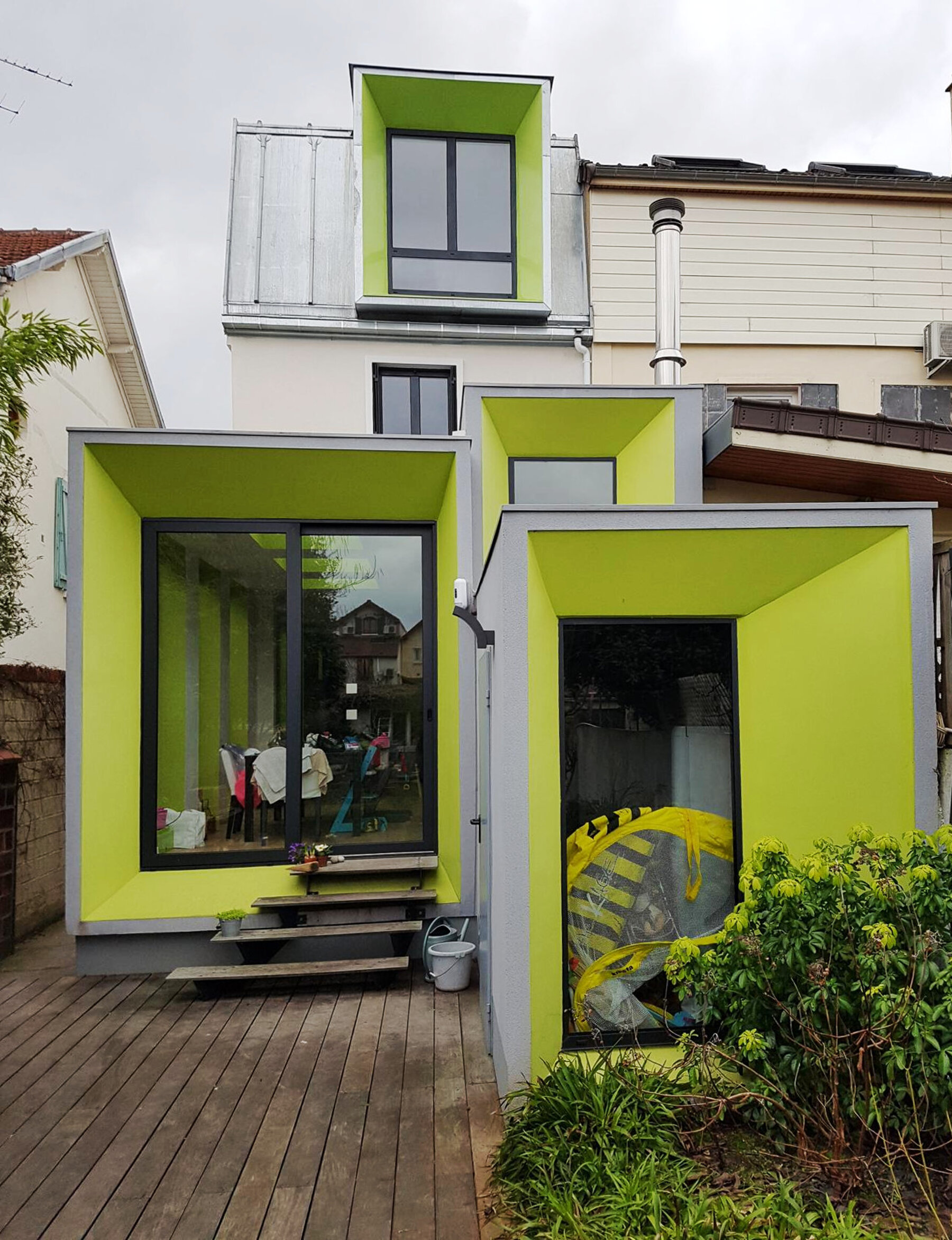 Projet d’extension et surélévation pour un pavillon tout en longueur. Le client souhaitait déposer la véranda existante, très vétuste. L’Architecte a proposé de créer un volume simple, ouvert vers le jardin, et d’habiller au même moment les deux petits volumes de la cuisine et de la buanderie pour ainsi les lier au projet. Le résultat est uniforme et bien rythmé, les trois corps s’étirent vers le jardin comme dans un jeu…